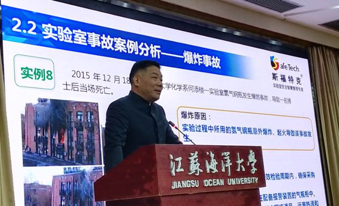 会上,上海联盈环保科技有限公司董事长南品磊作题为“防范化解实验室风险掌握安全主动权”的专题报告。他从化学实验室技术安全要点、实验室安全防护及规范管理、实验室安全检查和安全准入以及实验室安全体系建设等七个方面,结合生动的案例,针对高校目前普遍存在的化学安全、水电安全、设备安全等问题,进行了具体的分析和讲解。