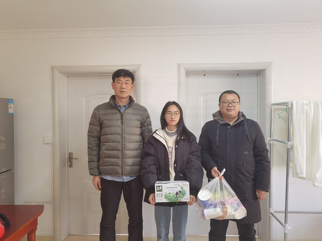 在陈恋亲戚家中,田德勇给陈恋同学送出了爱心礼包,并与她亲切交流,详细了解陈恋的家庭、学习和生活情况。田德勇鼓励陈恋合理安排假期生活,注意饮食规律,加强体育锻炼。针对该生家庭经济困难情况,郭利讲解了学校家庭经济困难学生有关资助政策。田德勇叮嘱陈恋遇到困难要及时与学院老师联系,学院会想办法帮助解决困难。最后,几位老师提前送上新春祝福。