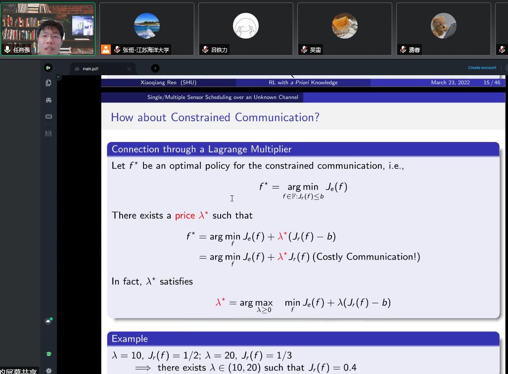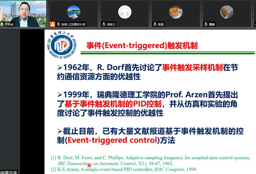 3月23日,学院分别邀请了华东理工大学信息学院严怀成教授(国家级高层次人才计划、科技部中青年科技创新领军人才)、武汉理工大学航运学院马勇教授(国家优青)、上海大学机电工程与自动化学院任肖强教授(国家海外高层次人才引进计划)为研究生开展线上学术报告。讲座由计算机工程学院副院长张恒教授主持。严怀成教授报告主要介绍了网络控制系统和事件触发控制的基本概念和最新研究进展;马勇教授报告重点介绍了船舶多受限情况下安全航行关键科学问题及研究进展;任肖强教授报告主要围绕如何把先验知识融入到强化学习的设计与训练的主题。专家们的报告深入浅出、理论联系实际。