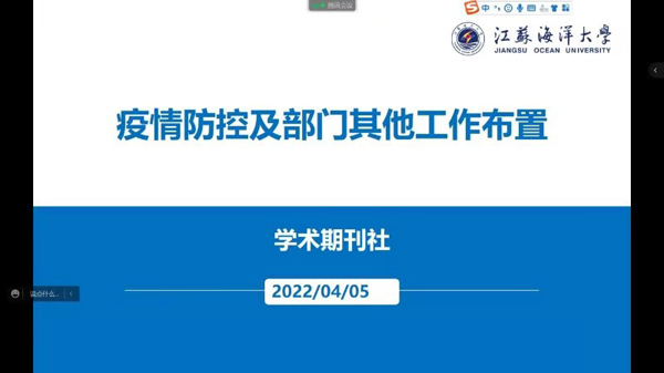4月5日下午,学术期刊社借助腾讯会议组织召开线上会议,传达学校关于新冠疫情防控工作的最新部署及本部门近期工作安排。会议由社长戴红伟主持,全体职工参加。