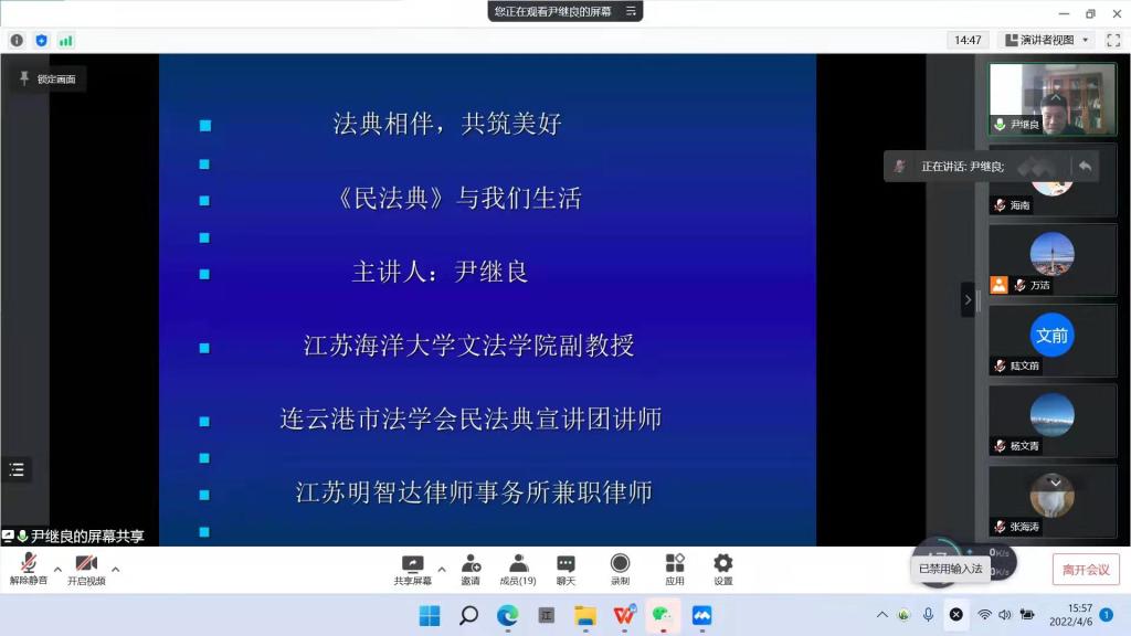 为了增强广大教职工的法治意识,普及法律知识,校工会于4月6日举办了“法典相伴,共筑美好《民法典》与我们生活”专题讲座,由连云港市法学会民法典宣讲团讲师、江苏明智达律师事务所兼职律师、我校文法学院尹继良副教授主讲,校专兼职工会工作者、教代会权益维护委员会委员及部分教职工在线聆听了讲座。
