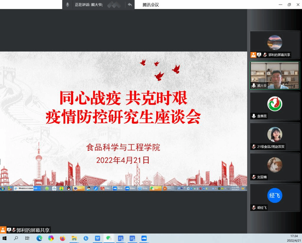 为落实学校疫情防控举措,聆听同学们关心的问题,4月20日至21日,食品科学与工程学院疫情防控本科生、研究生座谈会分别在线上举办。学院党总支书记田德勇、副院长盘赛昆、副院长吴少杰、副书记郭利、辅导员吴凡、辅导员陈丽媛分别与本科生、研究生共50多位学生代表共同参加线上座谈。座谈会由郭利主持。