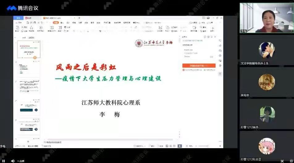 为进一步做好疫情期间大学生心理健康教育,帮助学生缓解校园封闭管理产生的压力与焦虑。4月27日下午三时,由校学生工作处主办、文法学院承办的“风雨之后是彩虹——疫情下大学生压力管理与心理建设”专题线上讲座顺利开展,主讲嘉宾为江苏师范大学教科院心理系李梅教授,校心理健康中心全体老师、文法学院党委副书记王国银、全体辅导员及全校各学院的学生参加了讲座,活动由文法学院院长吴明忠主持。
