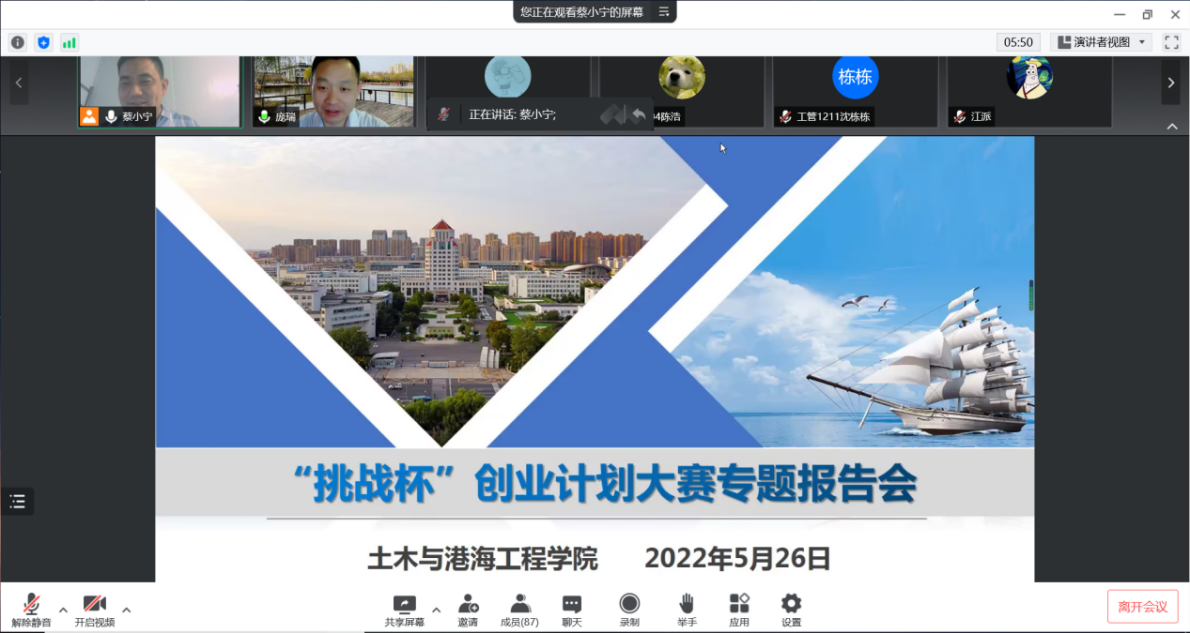 为进一步提升大学生科创水平,营造良好科技竞赛氛围,备战2022年“挑战杯”创业计划竞赛,5月26日,土木与港海工程学院特邀全国挑战杯总决赛银奖、铜奖指导教师、河南工业大学土木工程学院庞瑞教授及获奖学生梁世强为全院师生作线上“挑战杯”创业计划大赛专题报告。报告会由副院长蔡小宁主持。