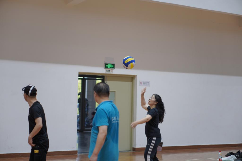 气排球场地,教工队基础相对扎实,毕业生队死守防线,发球、起跳、拦网、扣球,双方互相胶着,最终教工队以微弱优势获得了此次气排球赛的胜利。