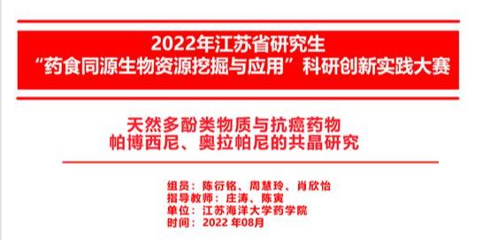 8月14日,2022年江苏省研究生“药食同源生物资源挖掘与应用”科研创新实践大赛获奖名单揭晓。药学院庄涛老师、陈寅老师指导药学专业研究生陈衍铭、周慧玲、肖欣怡参赛的项目“天然多酚类物质与抗癌药物帕博西尼、奥拉帕尼的共晶研究”荣获一等奖。