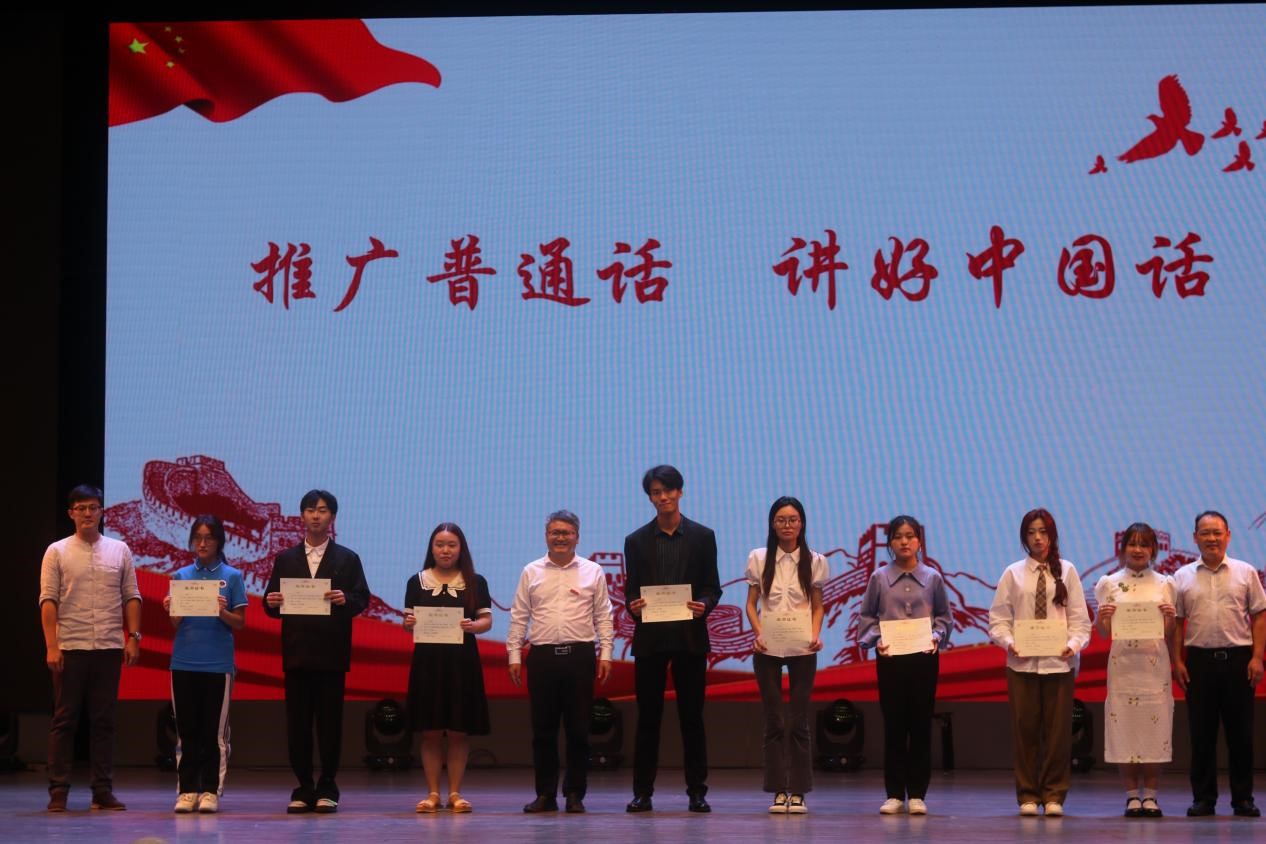 朱卫文点评结束后,由主持人宣读本次朗诵比赛获奖的队伍。获得三等奖的朗诵作品有《中华儿女》、《吊古战场文》、《倾吾青年之气力,成我青年之中国》等九支队伍,由院长吴明忠、副书记王国银、系主任宫肇南进行颁奖。