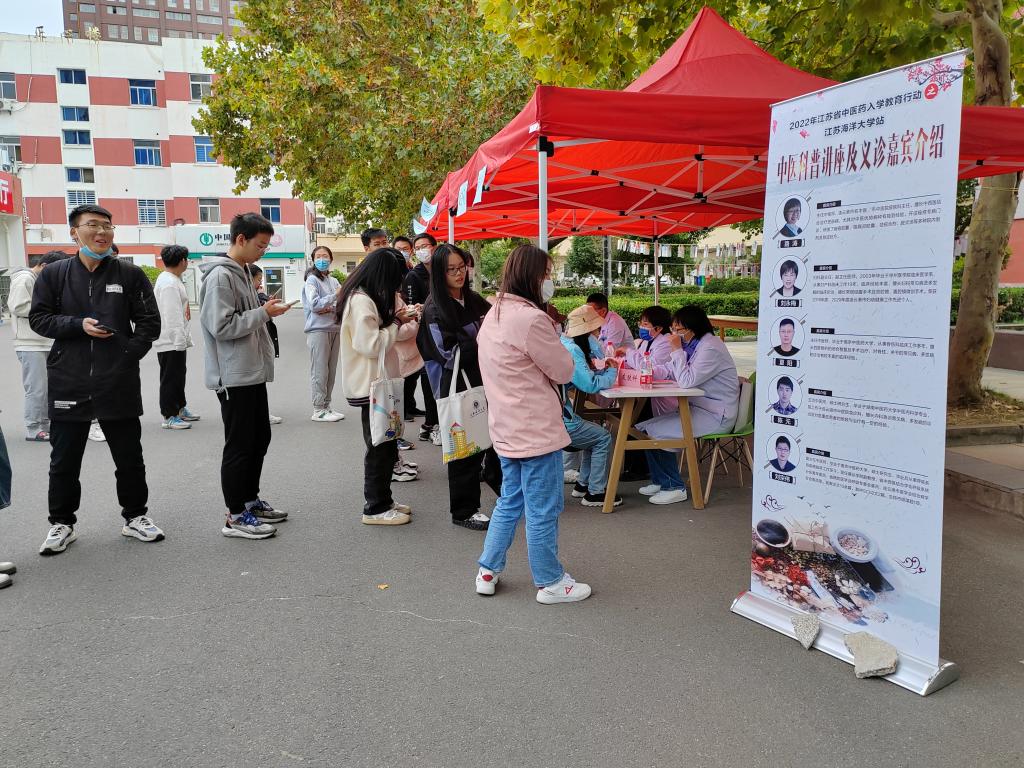在通灌校区前程餐厅广场,连云港市中医院刘宗伟、陆涛、刘永梅、陈元等医生现场为学生把脉问诊,耐心询问就诊学生症状,细心解答学生疑惑,科学诊断并给予治疗建议。