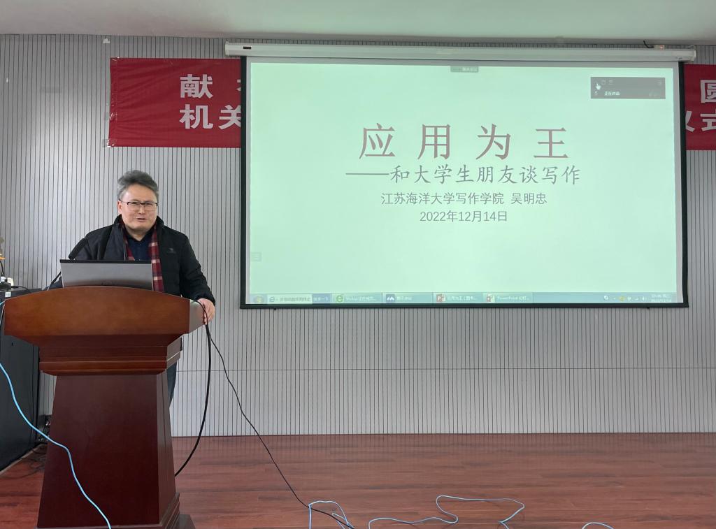 报告人江苏省写作学会副会长、江苏海洋大学文法学院院长、写作学院执行院长吴明忠围绕一个梦想、二大爱好、三种讲法、四个不适应、五步教学法等方面用幽默风趣的语言,深入浅出地阐述应用写作要具有晓事、积学、明理、涵情、换位、胆识六大诗外功夫,最终才能铸就“铁肩道义,妙手文章”的要义。