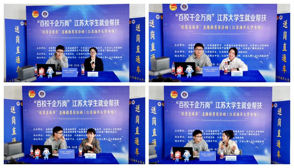 3月8日下午,由共青团江苏省委、江苏省教育厅、江苏省工业和信息化厅、江苏省人力资源和社会保障厅、江苏省政府国有资产监督管理委员会、江苏省广播电视总台主办,江苏海洋大学校团委、招生与就业处承办的“百校千企万岗”大学生就业帮扶江苏海洋大学专场“送岗直通车”直播荐岗活动在我校筑海楼二楼举办。本次活动通过校团委微信公众号和抖音号同步直播,直播间共吸引了千余人次观看,点赞量达到2.4万余次。