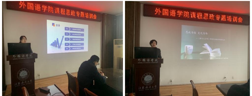 姜琴老师结合其省级课程思政示范课《安全心理学》等课程的思政建设经验,作了题为《课程思政规范化建设的几点建议》的报告,分别从课程思政建设验收材料要求、教学大纲中思政元素的体现、课程教案中思政元素的体现、PPT课件中思政元素的体现以及课程思政教学案例设计示例五大方面详细介绍了如何将思政元素融入到课程设计和专业教学之中。金鑫老师以《跨文化交际》课程为例,作了题为《思政为经,文化为纬》的报告,从中外节日、中文与英文和中外服饰三个方面的思政教学案例出发,向大家分享了课程思政教学案例设计的经验。