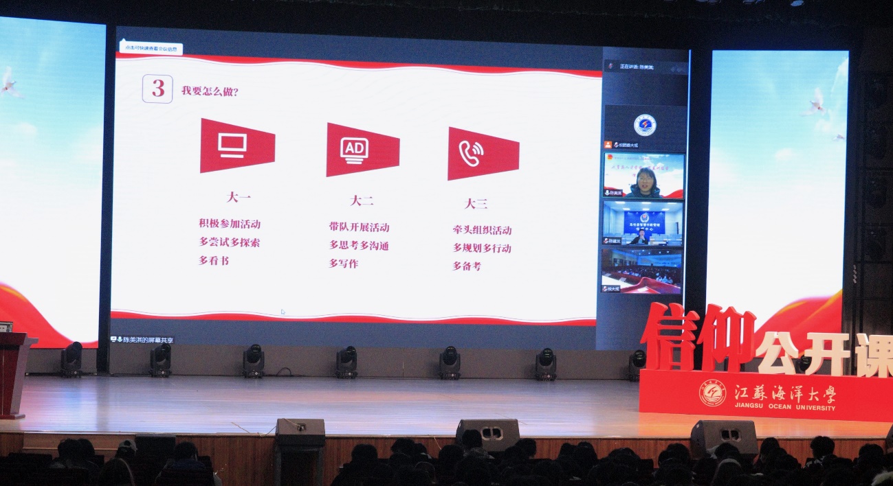 为深入学习宣传贯彻党的二十大精神,落实立德树人根本任务,引导广大青年在学思践悟中坚定理想信念,在奋发有为中践行初心使命。3月23日晚,江苏海洋大学“学习二十大 永远跟党走 奋进新征程”主题信仰公开课暨菁英人才学校第三期深蓝训练营活动在苍梧校区大礼堂顺利举行。2022级班长、团支书及学院团委干事等400余人参与了本次活动。