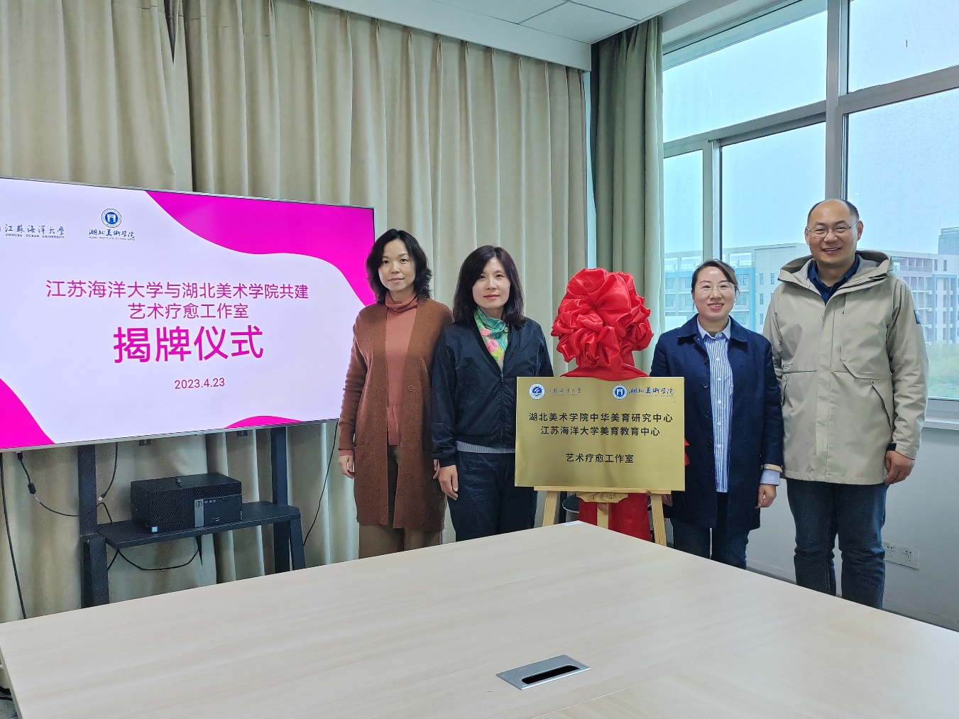 会后,曾英、徐帆共同主持了湖北美术学院中华美育研究中心和江苏海洋大学艺术设计学院美育教育中心共建“艺术疗愈工作室”揭牌仪式。