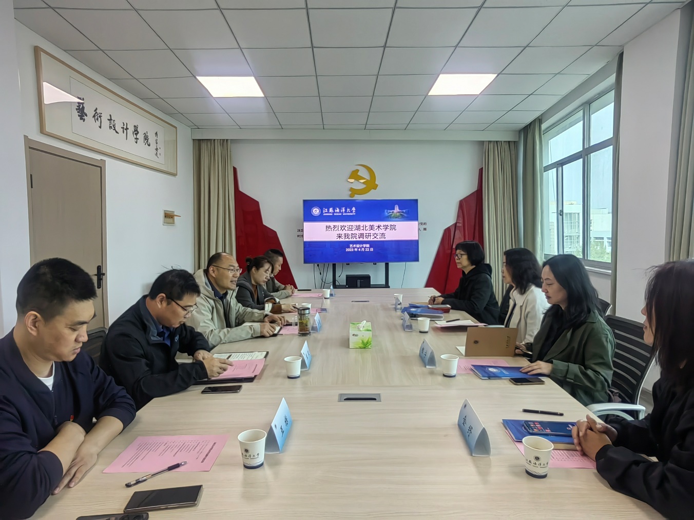 4月23日,湖北美术学院艺术教育学院党委书记徐帆、手工艺学院党委书记程宁、绘画学院党委书记黄清、艺术教育学院副教授金纾一行到我校艺术设计学院调研交流工作,学院党总支书记李春主持了座谈会,副院长曾英、院党总支副书记王欢、艺术基础教研室(美育教育中心)主任冯大康、东家智创设计创新工作室主任王栋参加了座谈。