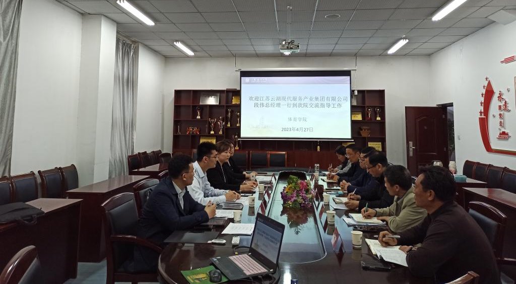 4月27日下午,江苏云湖现代服务产业集团有限公司段伟总经理一行到体育学院就加强校企合作进行调研交流,交流会由体育学院院长赵宏主持,研究生院院长陈书法、副院长秦海波、校招生与就业处副处长骆海宏及体育学院部分教师参加了交流。