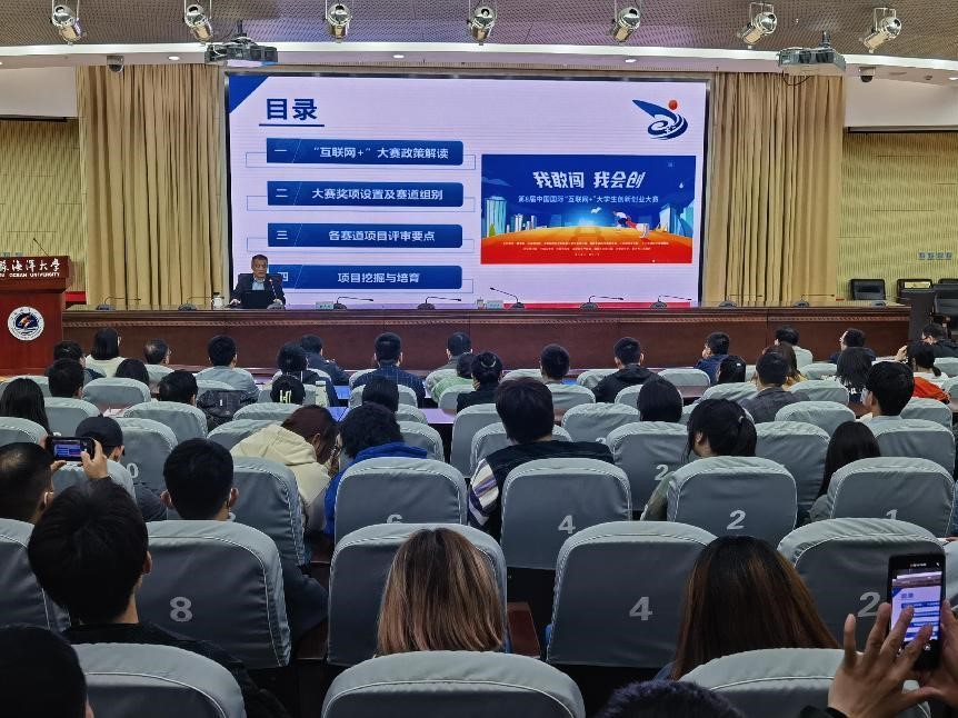 为做好第九届中国国际“互联网+”大学生创新创业大赛准备工作,准确理解和把握赛事内涵和要求,深入挖掘和培育我校创新创业项目,提升参赛项目水平,5月5日下午,我校特邀淮阴工学院创新创业学院院长赵志国教授作“‘互联网+’大赛政策解读、项目挖掘与培育”专题辅导报告。报告会由副校长严云洋主持,各学院教学院长、基层教学组织负责人、重点培育项目指导教师及团队学生、学院教师代表现场聆听了报告。