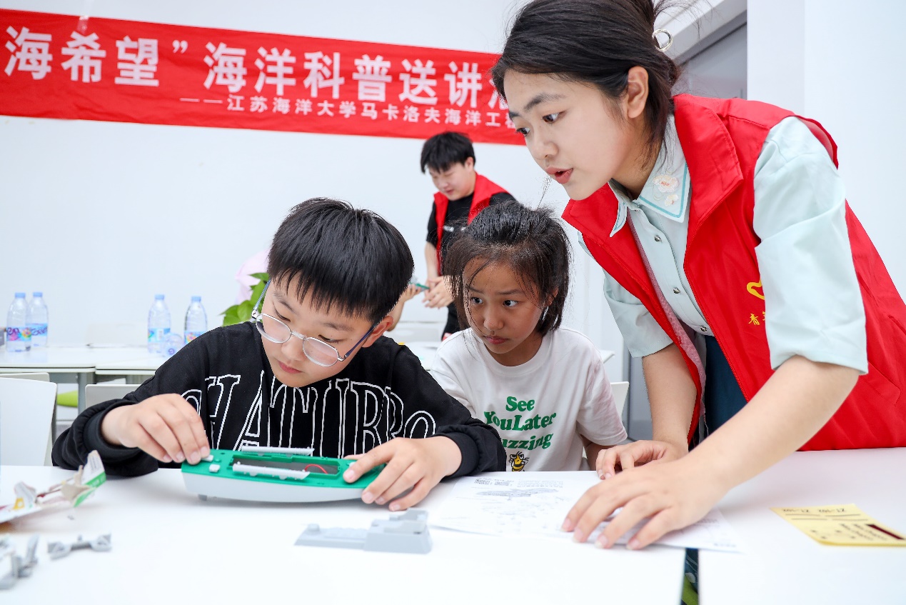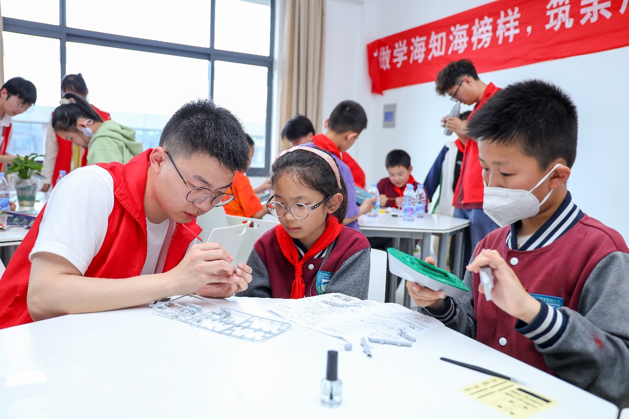 在马卡洛夫海洋工程学院学生活动室,学院结合船舶与机器人专业特点,为孩子们精心安排了船模制作活动。志愿者们讲解模型构造、演示分装步骤,与小学生讨论拼装技巧。经过共同努力,一艘艘船体模型组装完成并“下水”成功。小学生们在水池边对着自己的船模欢呼雀跃,喜悦的还有看到海洋强国梦想得到传承的海大师生们。