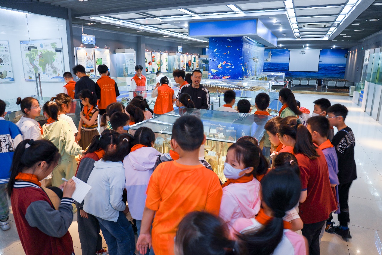 在江苏海洋大学海洋馆,小学生们在学院“小海马”志愿者的陪伴下参观了海洋生物展区和地学展区。世界罕见的鲥鱼标本、扬子江白鲟标本、巨型天然单体巨晶和恐龙蛋化石等珍贵展品让小学生对奇特有趣的生物和海洋蕴藏的资源加深了了解,拓展了他们的海洋视野。“我长大了,要当研究鲸鱼的科学家!”、“老师,恐龙蛋化石有没有可能孵化出小恐龙?”充满童趣的话语让人忍俊不禁又心生感慨。