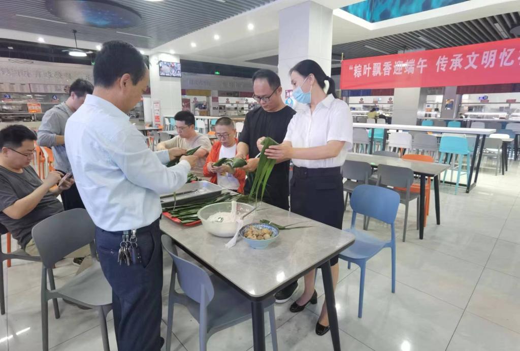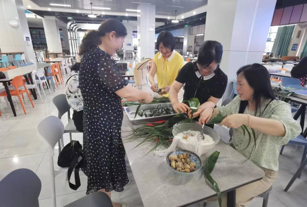 参加活动的教职工在食堂师傅指导下,认真学习包粽子方法和要领,大家互帮互学,其乐融融。很快,在一片欢声笑语中,一个个粽子便堆满了餐盘。