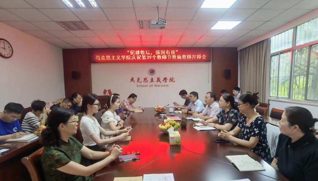 为深入学习贯彻党的二十大精神,强化师德师风宣传教育,弘扬高尚师德风范,9月8日上午,马克思主义学院开展“躬耕教坛,强国有我”庆祝第39个教师节暨新教师拜师会。会议由马克思主义学院院长沈春梅主持,学院全体教职工参加会议。