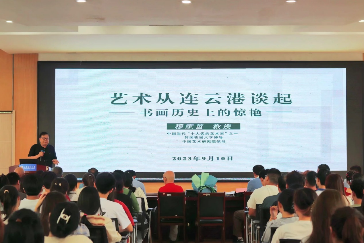 9月10日下午,《艺术从连云港谈起——书画历史上的惊艳》讲座在我校通灌校区诚意楼报告厅举行,艺术设计学院部分教师及学院2023级全体新生240多人参加。本次讲座由中国艺术研究院硕导、韩国牧园大学博导、中国当代“十大优秀艺术家”穆家善教授主讲,江苏海洋大学艺术设计学院主办,《新丝绸之路》杂志社协办。