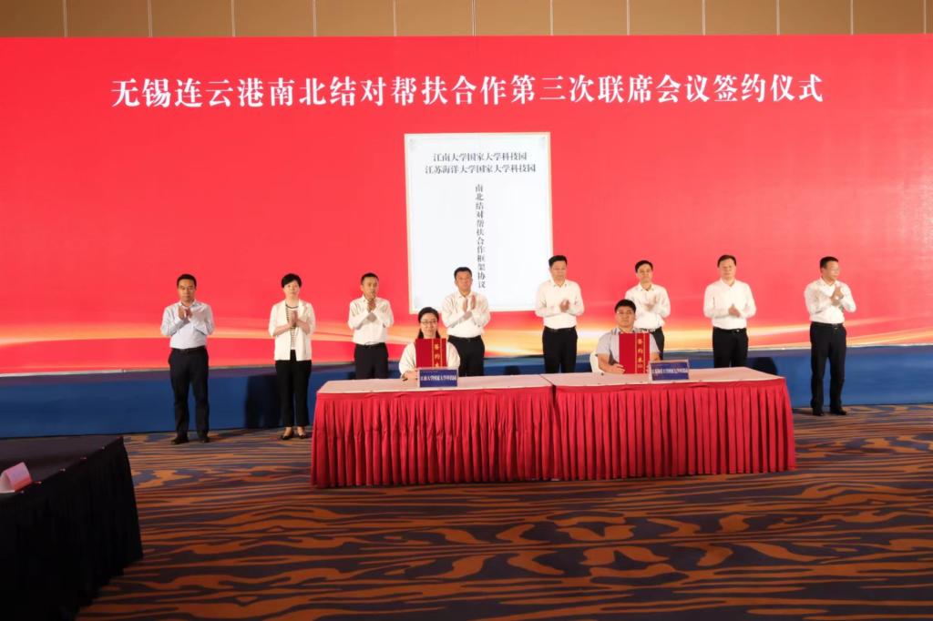 9月16日,无锡连云港南北结对帮扶合作第三次联席会议在花果山大酒店隆重举行。会上江苏海洋大学国家大学科技园与江南大学国家大学科技园在无锡连云港四套班子领导的见证下签署了南北结对帮扶合作框架协议。