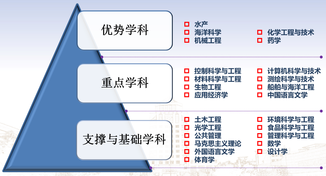 进一步凝练学科方向,打造学科标志性成果产出力度。“十三五”省重点学科终期验收“生物工程”获批优秀,“生物工程”“应用经济学”“药学”“机械工程”四个学科获批“十四五”省重点学科B类建设计划。省优势学科“海洋科学”顺利通过省三期项目验收并进入四期项目建设,进一步凝练学科方向,目标任务导向,积极开展项目建设。启动学科影响力提升工程,通过两年来强力推进,工程学学科首次进入ESI前1%,植物与动物科学、化学学科影响力持续提升。学校多位教师担任中国海洋湖沼学会、中国水产学会、中国海洋工程咨询协会的理事等国家级学术团体的理事,学校学科影响力持续提升。