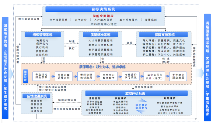 重构培养方案,完善质量保障体系。学校坚持以服务海洋强国战略、“一带一路”建设和区域海洋经济发展为己任,依据办学定位,进一步明确在落实五育并举的育人基础上,着力培养具有海洋意识、创新精神、家国情怀的复合应用型人才。制定《关于进一步加强本科教育的若干意见》,2020年启动培养方案重构工作,将“学生中心、产出导向、持续改进”理念融入教育教学全过程,培养方案做到“三个贯穿”,即将课程思政、通识教育、创新创业教育贯穿其中。制定《江苏海洋大学本科教育教学质量保障体系建设实施意见》,按照“以生为本、追求卓越”的质保理念,系统构建了“6S7D”本科教育教学质量保障体系,实施人才培养全过程质量监控与管理,强化育人运行机制和质量保障机制建设,有效汇聚全员育人合力。