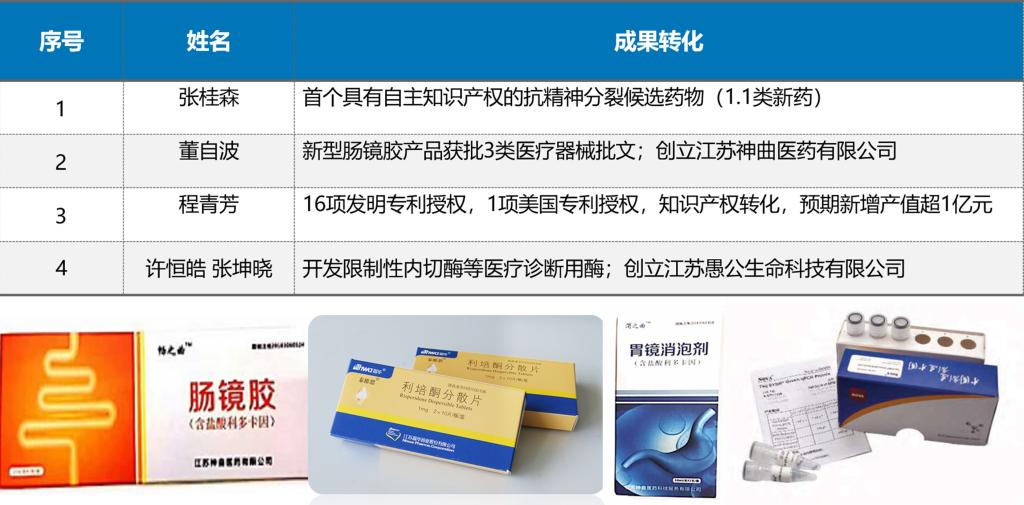 学院积极对接连云港医药企业,充分发挥高层次人才优势,不断加强产学研合作,为区域经济高质量发展提供智库作用。多项科研成果实现转化,张桂森教授获批首个具有自主知识产权的抗精神分裂候选药物(1.1类新药);董自波教授开发的新型胃镜消泡剂和肠镜胶产品,先后获批3类医疗器械批文,并创立江苏神曲医药有限公司;程青芳教授获得16项发明专利授权,1项美国专利授权,知识产权转化,预期新增产值超1亿元;许恒皓、张坤晓博士科技攻关开发限制性内切酶等医疗诊断用酶,创立江苏愚公生命科技有限公司。