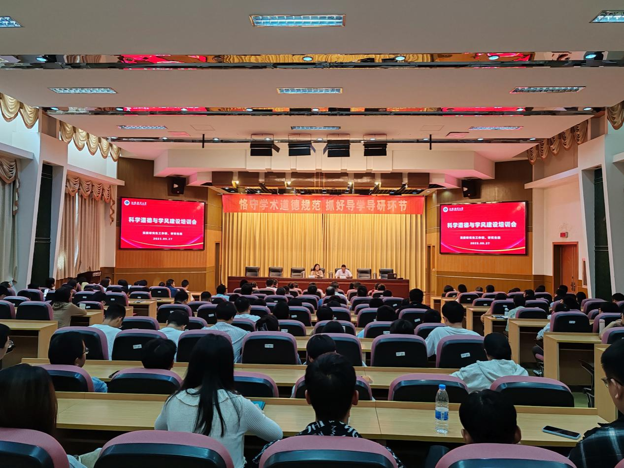 为深入学习贯彻党的二十大精神,全面落实贯彻习近平总书记关于弘扬科学家精神的重要指示精神,提升广大研究生的科研规范意识,杜绝学术不端行为,强化优良学风建设,9月27日下午,党委研究生工作部、研究生院组织我校2023级研究生和新聘导师在文博楼报告厅举办科学道德与学风建设专题培训,邀请中国知网研学平台事业部刘雨婷老师作了题为“恪守学术道德规范 抓好导学导研环节 数字化赋能研究生培养质量提升”专题报告。培训会由研究生院副院长高嵩主持。