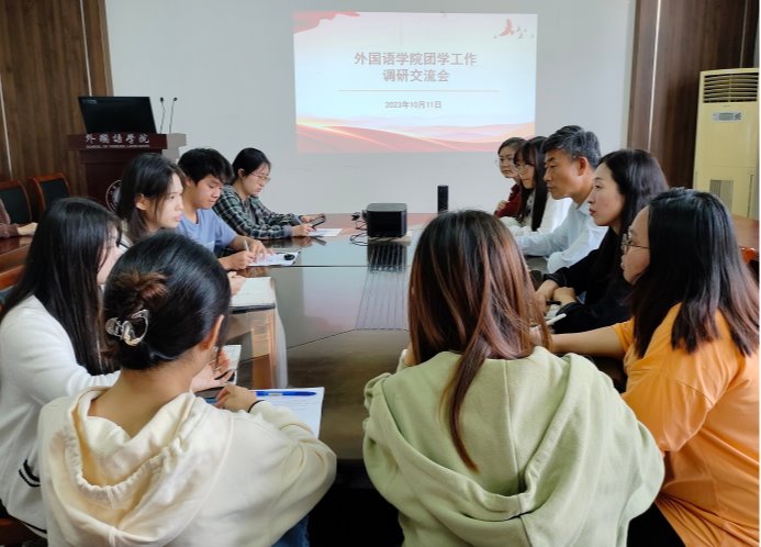 为深入学习贯彻党的二十大精神,加强学院对大学生思想政治教育的指导作用,进一步提升基层团学组织的凝聚力和战斗力,10月11日下午,外国语学院于文渊楼269召开团学工作调研交流会,参加会议的有外国语学院党委书记田德勇、院团学组织主要学生干部,会议由院团委书记王熙主持。