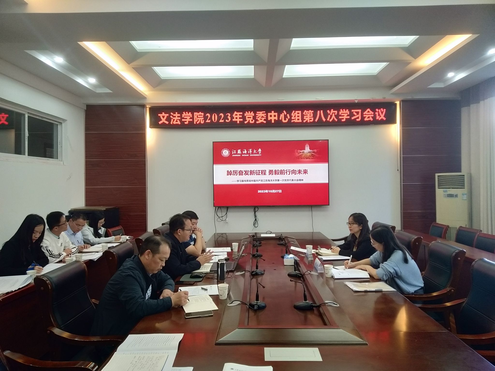 10月27日,文法学院党委副书记王国银、党政办主任张建、副院长颜金依次领学了习近平总书记重要讲话精神、海洋强省相关政策内容。交流发言环节,王国银立足工作岗位,围绕学院学生工作,颜金结合文法学院专业发展,围绕江苏海洋产业发展行动方案,分别畅谈了未来的工作目标和思路。文法学院党委书记魏范青重点解读了中共江苏海洋大学第一次党员代表大会精神,结合学院高质量发展指标完成情况,提出未来在党的建设、学科建设、人才培养、科学研究与社会服务等领域的发展规划。金芙蓉对此次专题学习表示肯定,她认为此次学习准备充分,内容丰富,点面结合,重点突出。她对中心组提出三点建议:一是强化理论武装,筑牢思想根基。特别是要及时坚持跟进党的创新理论学习,拧紧思想认识的螺丝钉,大力营造浓厚的学习氛围;二是坚持学以致用,理论指导实践。从自身学科建设出发,立足本职岗位,紧跟学校海洋特色发展步伐,尽快找准学院发展定位,谋划发展思路,落实发展举措,各个学科齐头并进;三是凝聚发展共识,抢抓发展机遇。学院应当主动与校内外部门间寻求合作,汇聚发展合力,服务地方社会发展,紧密跟踪青年人的成长历程,激励他们同时间赛跑,补短板、强优势、争上游。