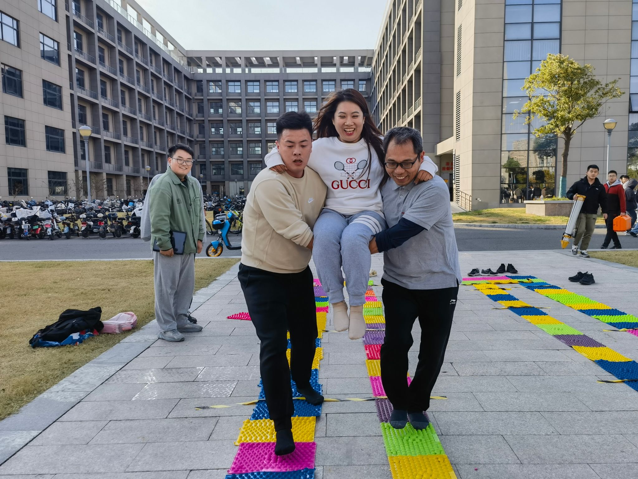 比赛设置A、B两条路线,总路程约5公里。每条路线隐藏和布置打卡点与游戏点各四处。按照比赛规则,打卡点环节,参赛队员需通过识读地图来确定打卡点空间位置,并根据地图标示的点标顺序依次完成定向打卡任务。游戏点环节,参赛队员需团结一致、齐心协力完成“煎鸡蛋+手剥橙子”“指压板大挑战”“搭轿子”和“趣味套圈”四个团队型游戏任务。