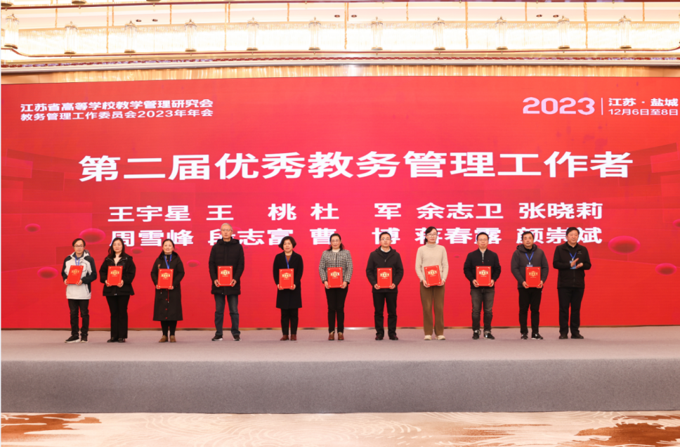 12月7日,江苏省高等学校教学管理研究会教务管理工作委员会2023年年会在盐城召开,本次会议的主题是“高校数字化教育教学转型升级的探索与实践”。大会对第二届江苏省高等学校优秀教务管理工作者和首届优秀会议论文获得者等进行表彰,我校教务处周雪峰老师荣获“优秀教务管理工作者”的称号,高红霞老师论文喜获首届优秀论文一等奖。