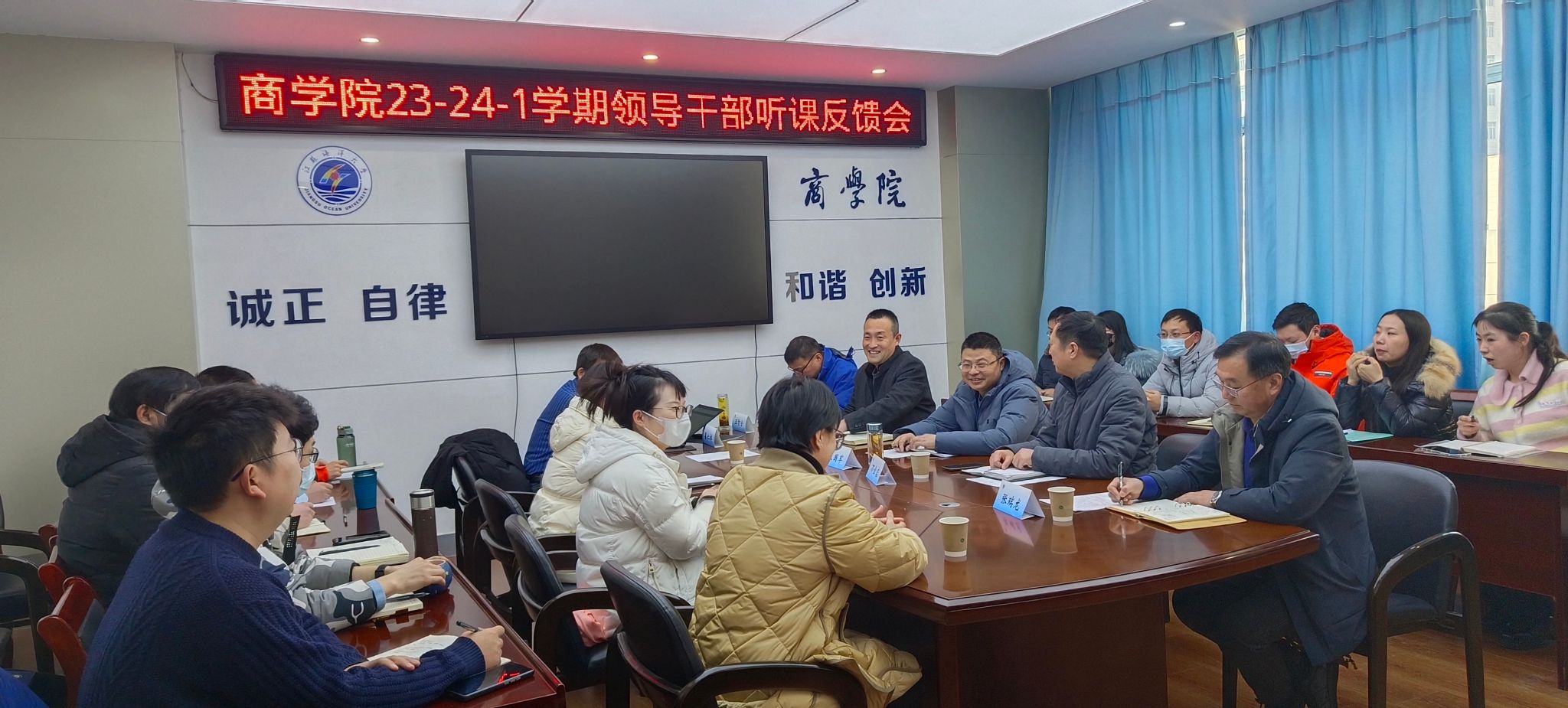 为了提高本科教学质量,提升青年教师授课水平,12月19日下午,商学院在文渊楼355室召开了2023-2024-1学期领导干部听课集中反馈会。副校长朱国军出席会议并讲话。会议由商学院院长孙军主持,商学院领导、新入职青年教师和部分老教师参加了会议。