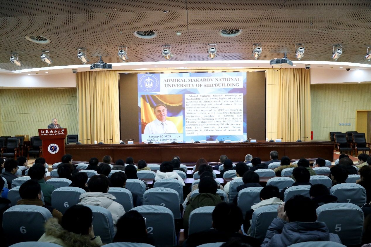 Trushliakov Eugeniy校长一行与全体师生在会议中心黄海厅举行见面会。Trushliakov Eugeniy做现场演讲,阐释知识、教育对未来的意义;以“The sea of knowledge is boundless.”鼓励学生在日新月异、飞速变革的时代潜心学习,专注发展;介绍了马卡洛夫国立造船大学的办学历史、学科分布、国际交流、科研创新、实习基地、校园生活、远程教育等情况。在现场交流环节,与会师生踊跃发言,就“暑期学术交流”、“新兴造船理念”、“海洋生态保护”等话题与Trushliakov Eugeniy进行互动交流。