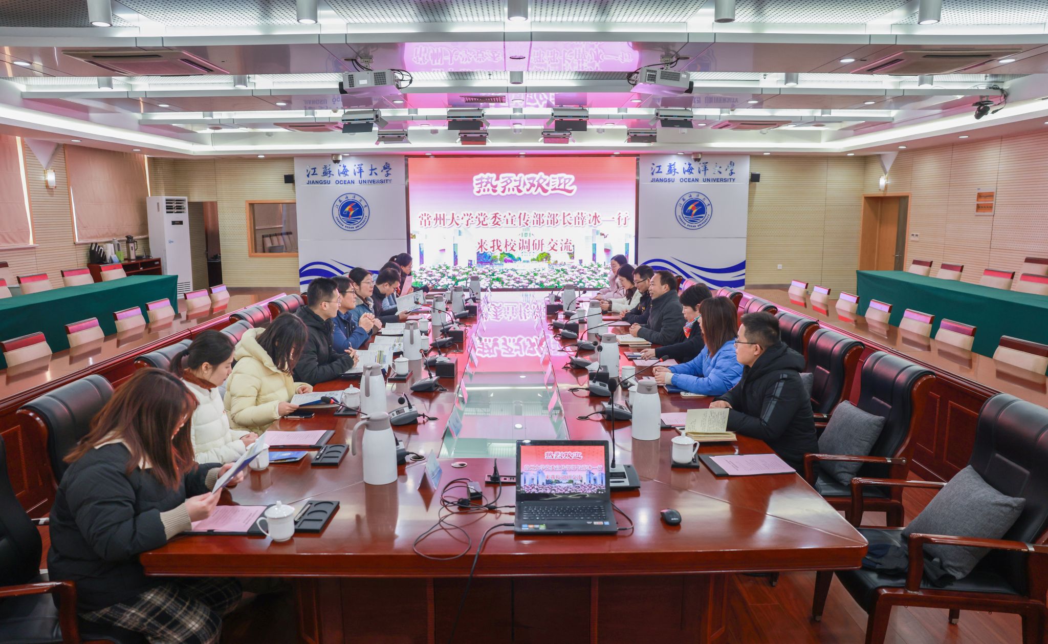 双方共同观看学校宣传片《风从江海来》。
