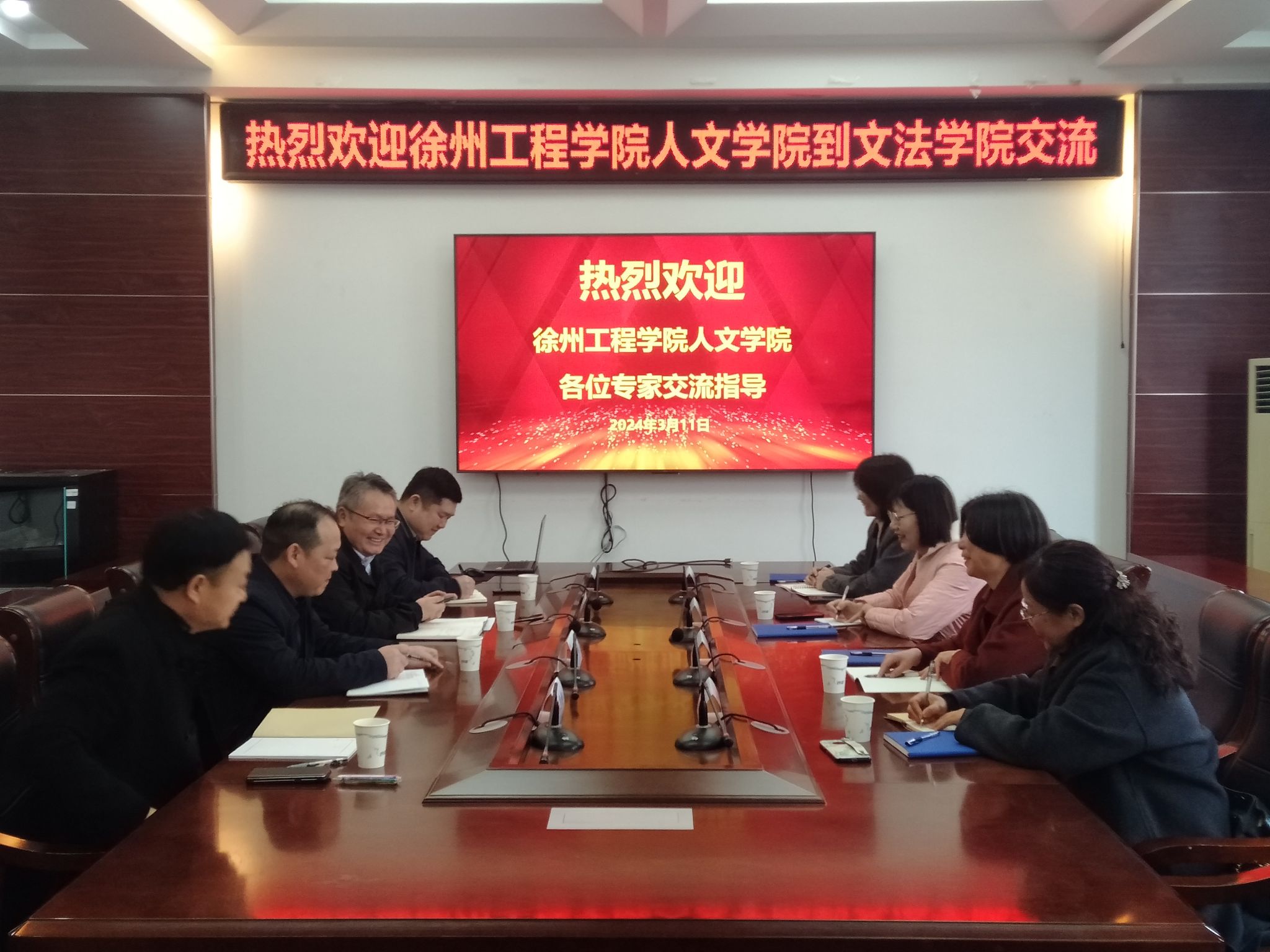 春暖花开,有朋东来。3月11日上午,徐州工程学院人文学院党委副书记孟艳、副院长吴云一行4人来到文法学院调研交流。双方就工科院校背景下文科学院如何加强学科专业建设进行了深入交流。院长吴明忠、学院党委副书记王国银、副院长颜金,徐州工程学院人文学院文学教研室主任盛翠菊、汉语与写作教研室主任滕华英,文法学院中文专业负责人王恩建和实验中心主任郑佳武参加调研交流。