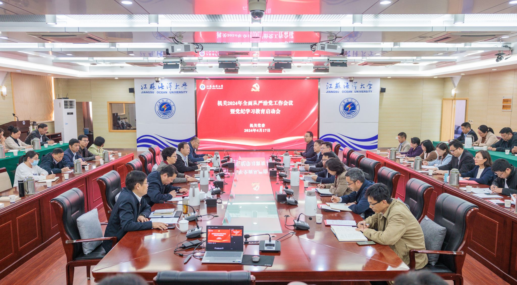 4月17日下午,机关2024年全面从严治党工作会议暨党纪学习教育启动会在会议中心东海厅召开,机关各党支部委员、机关党委专兼职工作人员近70人参加会议。校党委副书记李梅英出席会议并讲话。会议由机关党委书记汪守建主持。
