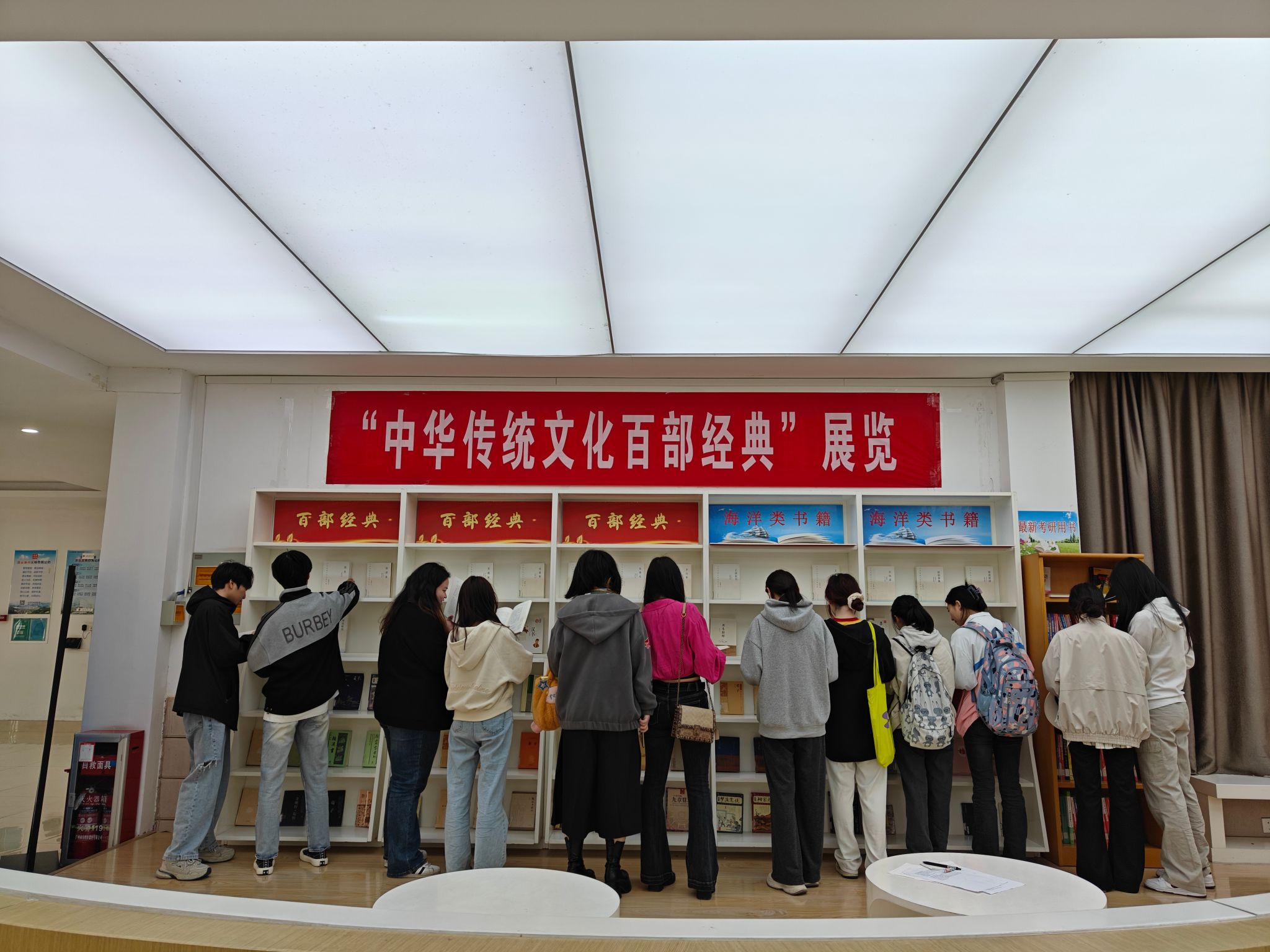 在图书馆东门大厅设立“中华传统文化百部经典”书展专区。由图书馆提供70种左右的中华传统文化经典典籍,涵盖了经、史、子、集等多个领域,读者可以现场根据自己的阅读需求自主选择感兴趣的图书借阅。本次活动吸引了大量老师和学生的关注,并来到现场观展借阅,亲身感受传统文化的魅力。这不仅提高了广大师生对传统文化的认知和兴趣,也为传统文化的传承和发展注入了新的活力。