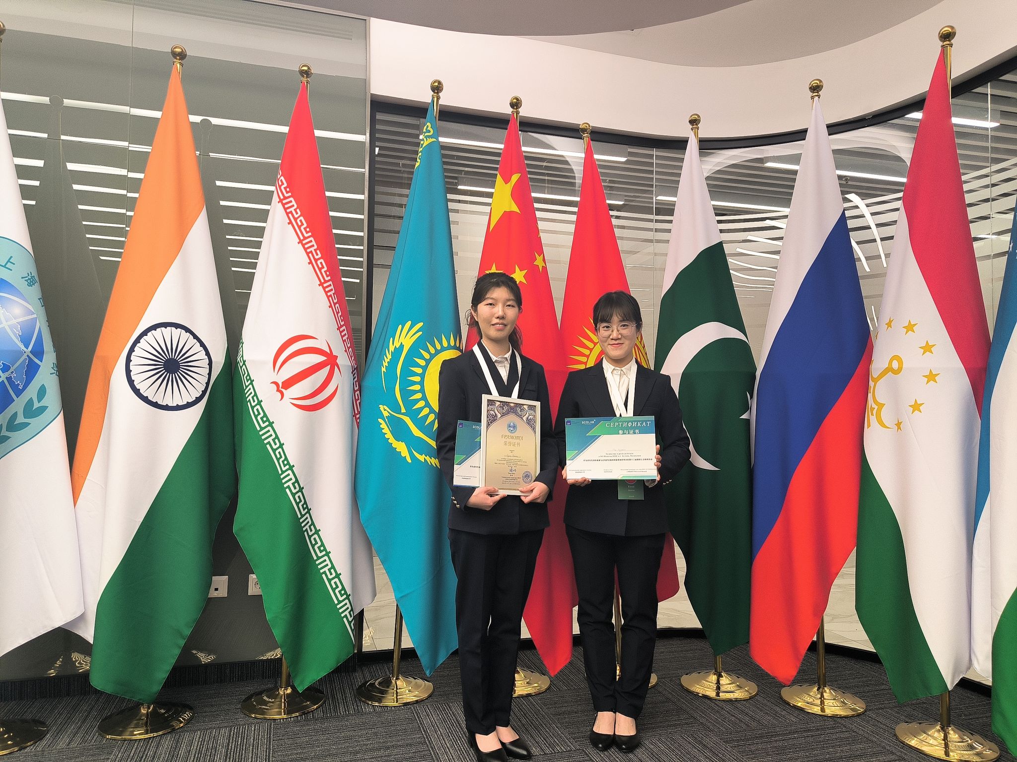 我校俄语专业学生蒋梦雨、尹嘉丽作为中国青年代表与会,同来自上合组织9个成员国、3个观察国的青年代表们围绕主题阐明立场,磋商讨论,并撰写发布联合声明。蒋梦雨以中国首席代表身份,阐述了中国连云港作为上合组织国家出海口与上合组织成员国之间陆海联运通道的建设成果及问题挑战,提出了构建绿色、高效的陆海联运通道的具体建议,发言得到与会代表的一致认可。通过流畅的俄语表达及优异现场表现,蒋梦雨被选为本次会议“最佳新人”,上合组织哈萨克斯坦国家协调员穆拉特•穆库舍夫为其颁发获奖证书。新亚欧陆海联运通道研究院被评为“优秀贡献奖”。