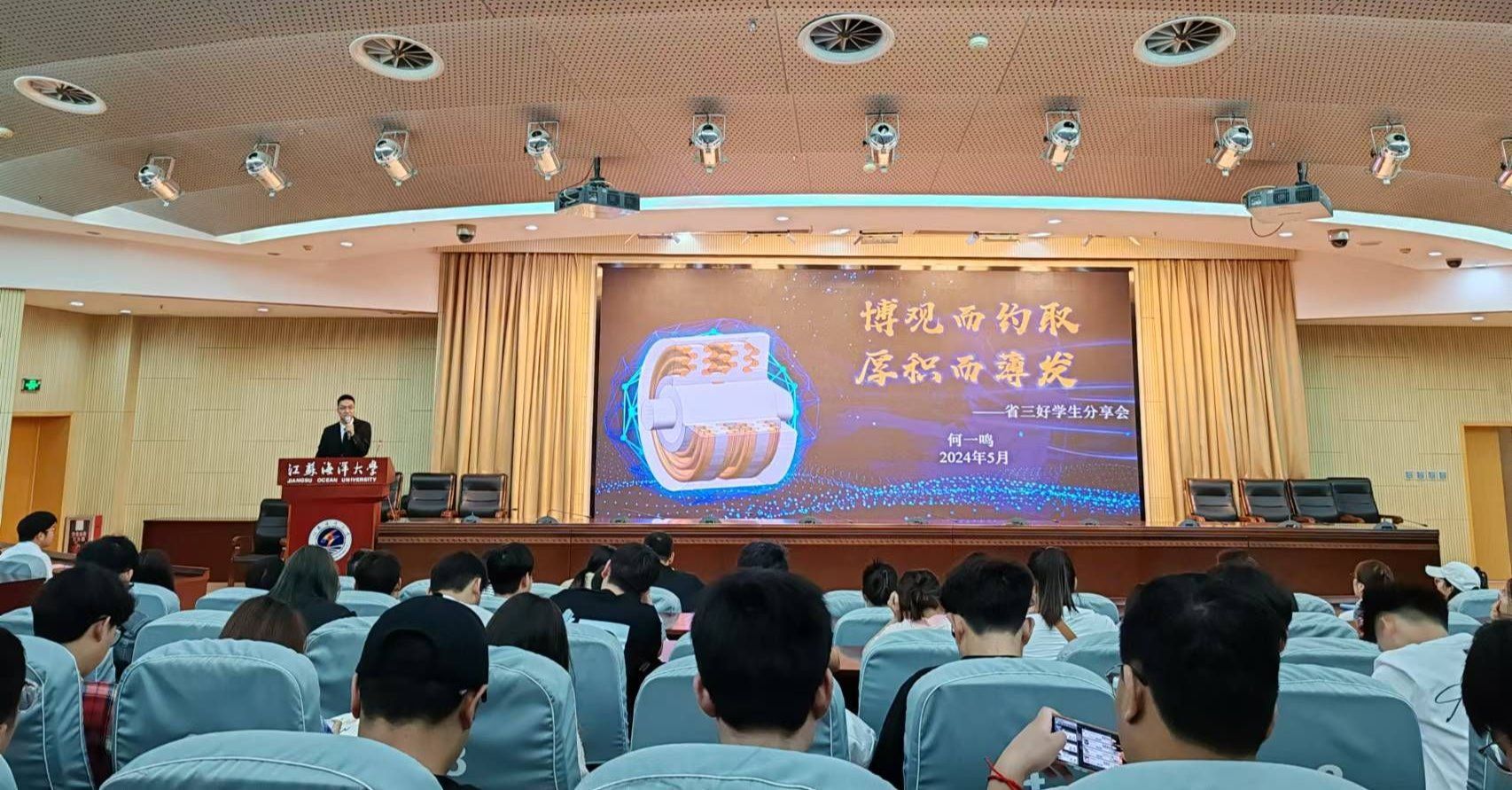 为加强我校研究生学风建设,发扬朋辈榜样的示范引领作用,5月22日下午,校党委研究生工作部、研究生院在会议中心黄海厅召开“研途共进 榜样领航”2024年研究生省优经验分享会,此次活动也是第二届“海洋嘉年华”系列活动之一。我校获得省“三好学生”、“优秀学生干部”、“优秀毕业生”称号的4名研究生和省“先进班集体”代表进行了经验分享,党委研究生工作部、研究生院相关同志及各研究生培养学院的研究生辅导员、200余名研究生代表一并参加。
