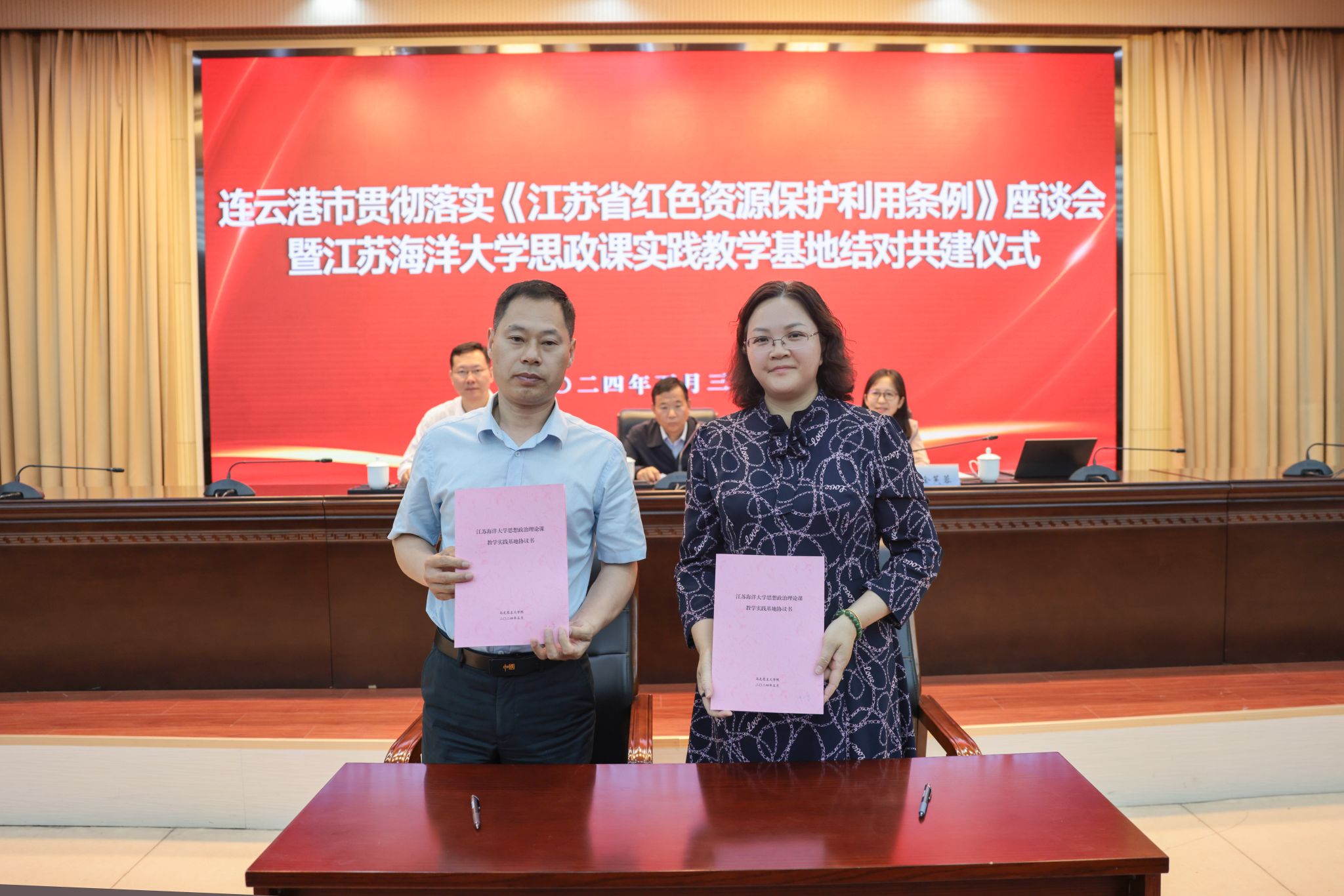 5月31日下午,《江苏省红色资源保护利用条例》座谈会暨江苏海洋大学思政课实践教学基地结对共建活动在我校会议中心黄海厅举行。校党委常委、副校长金芙蓉,省委宣传部宣传教育处(国防教育处)二级调研员陈辉,校党委常委、宣传部部长王波出席活动。活动由连云港市委宣传部副部长、市新闻出版局(市版权局)局长李武主持。连云港市相关职能部门负责人及连云港市国家级、省级爱国主义教育基地、国防教育基地负责人,马克思主义学院全体教师及学生代表100余人参加了活动。