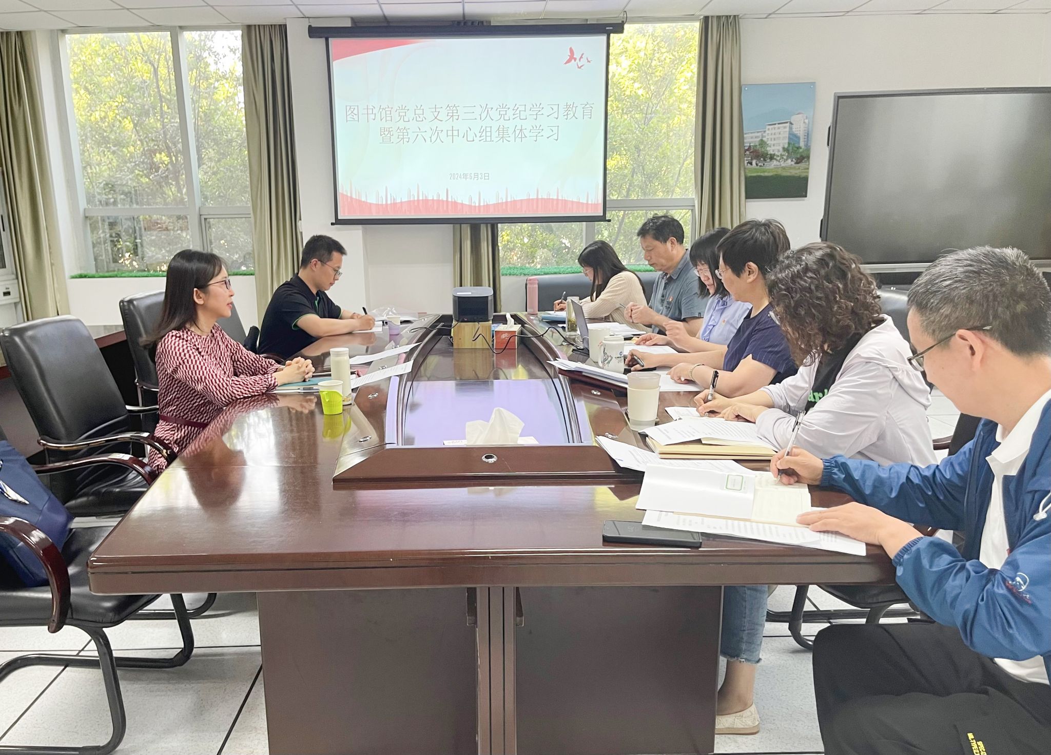 6月3日,图书馆党总支召开第三次党纪学习教育暨理论学习中心组第六次集体学习会,深入学习《中国共产党纪律处分条例》第八章对违反廉洁纪律行为处分的内容。理论学习中心组成员对违反廉洁纪律行为处分的原文逐条学习,并集体观看了典型违纪案例警示教育视频。副馆长田为付和党总支班子成员张英作重点发言,中心组其他成员结合工作实际依次交流学习体会。