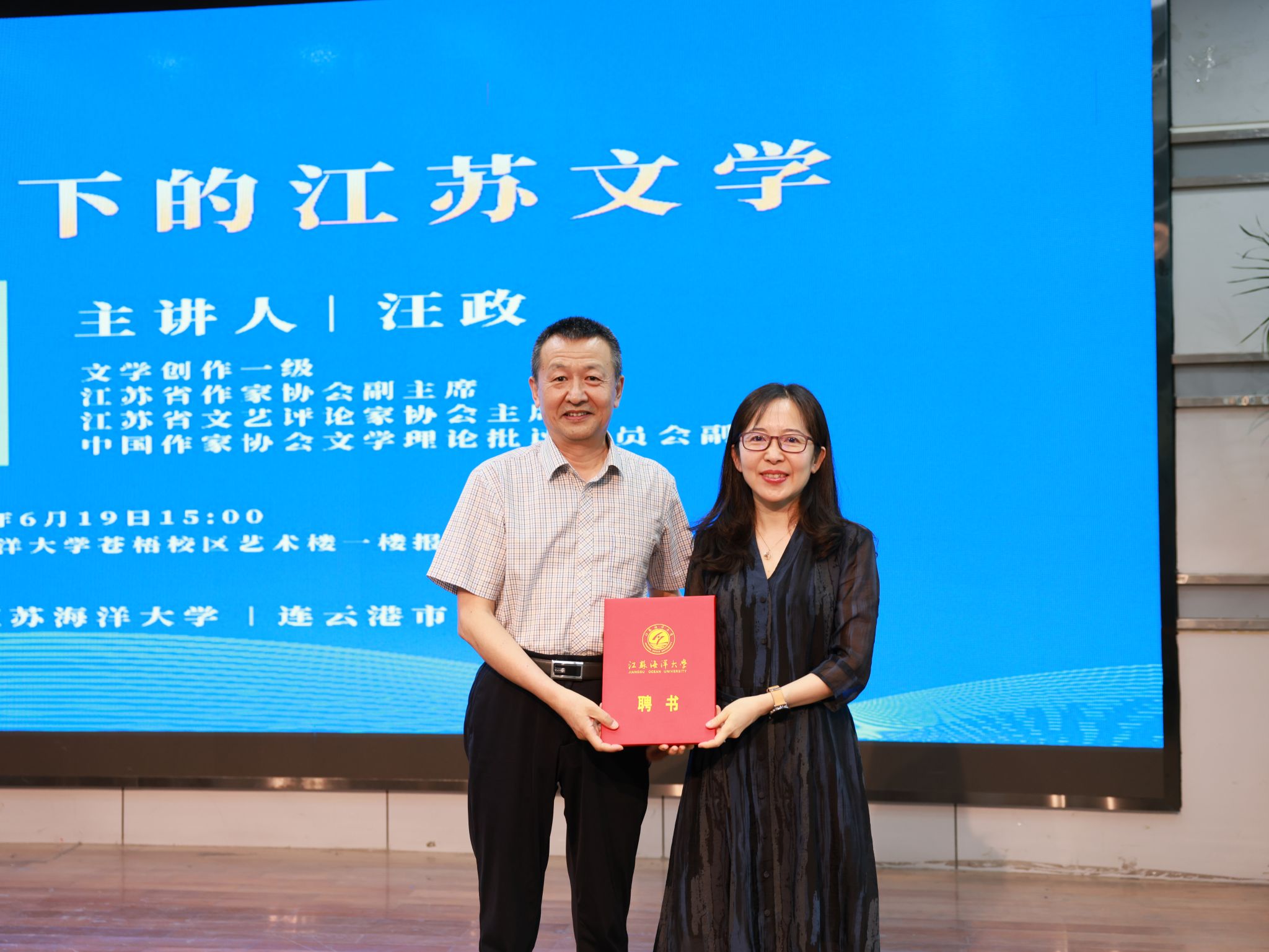 6月19日下午,我校在苍梧校区艺术楼报告厅举行仪式,聘请江苏省作家协会副主席汪政担任江苏海洋大学客座教授。校党委常委、副校长金芙蓉受宁晓明校长委托,为汪政教授颁发聘书。连云港市文联主席王咏梅主持讲座。市作协主席王成章,市文联副主席俞文文,我校文法学院院长吴明忠、中文系师生代表和连云港市县作家代表认真聆听了讲座。