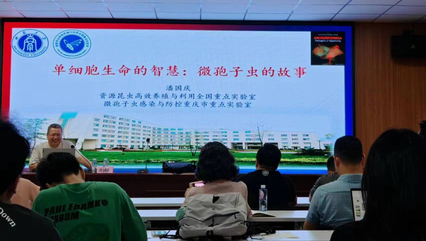 报告会上潘国庆教授站在生命起源和演化意义的哲学高度阐释了生命的价值和意义,并以微孢子虫繁殖发育的策略为主题,详细阐述了他们课题组30多年来在微孢子虫研究上获得的成果。报告引起了师生的共鸣,报告会结束后,师生还一直围着潘国庆教授就微孢子虫分类、感染机制、防治措施等问题进行了热烈的讨论。