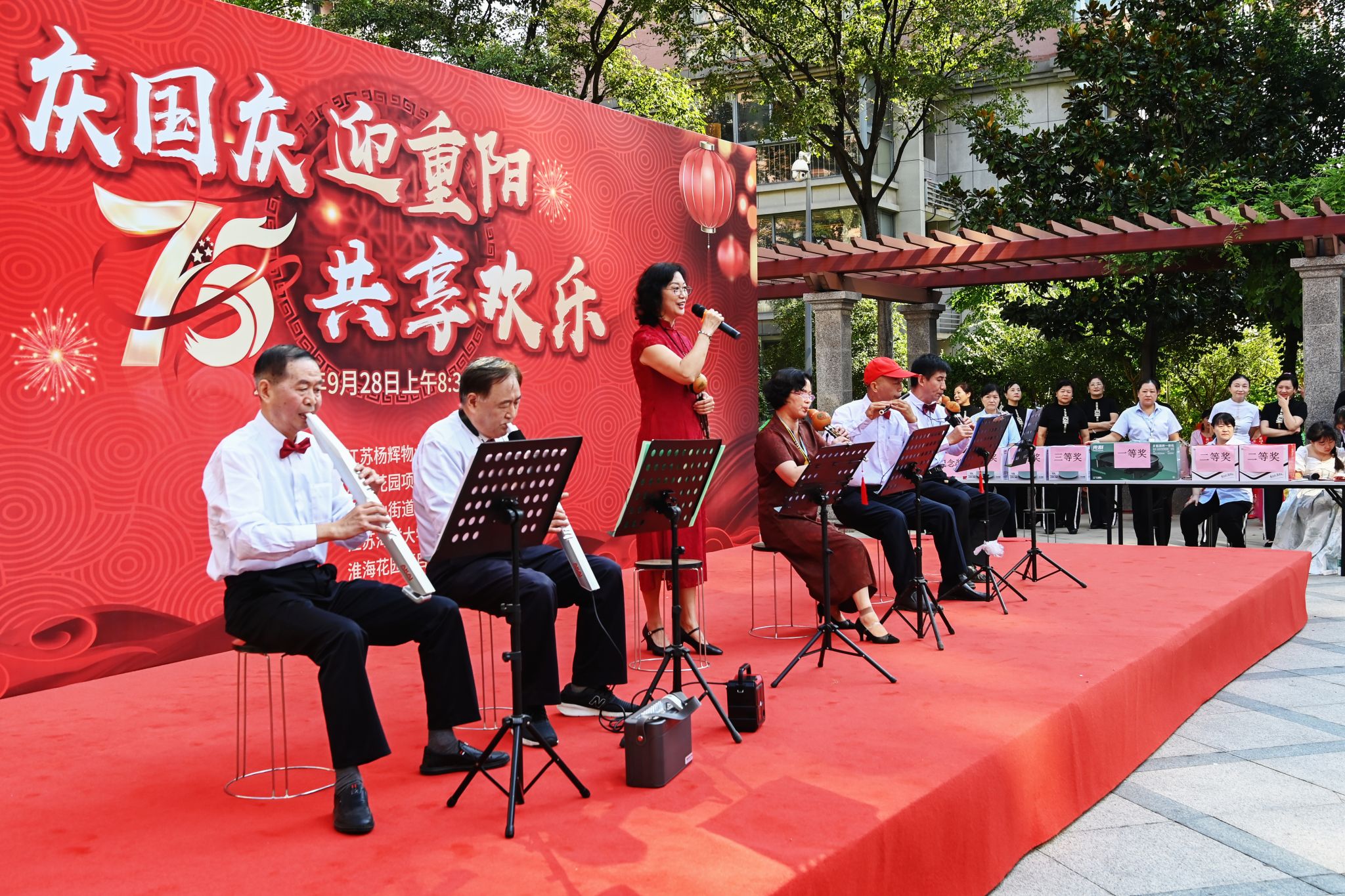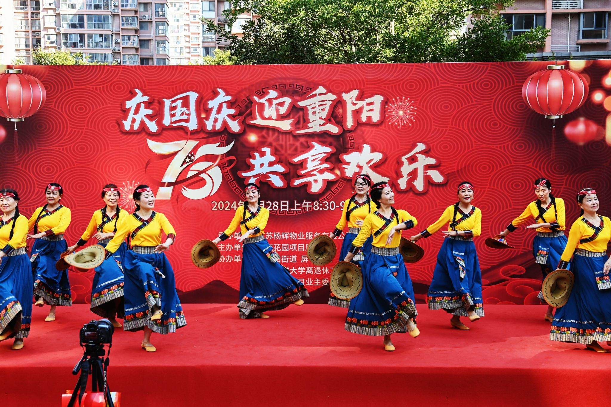 文艺演出中,我校退休老同志为社区居民表演了藏族舞蹈、器乐合奏、诗歌朗诵、小合唱、八段锦、时装秀、笛子联奏和独唱等节目,展现了我校离退休老同志健康快乐的精神风貌,表达了对伟大祖国的深情祝福,赢得了淮海花园业主们的广泛好评,活动现场高潮迭起、掌声和叫好声不断。整场演出在我校退休职工芦士香优美的《五星红旗》歌声中结束,演出取得圆满成功。