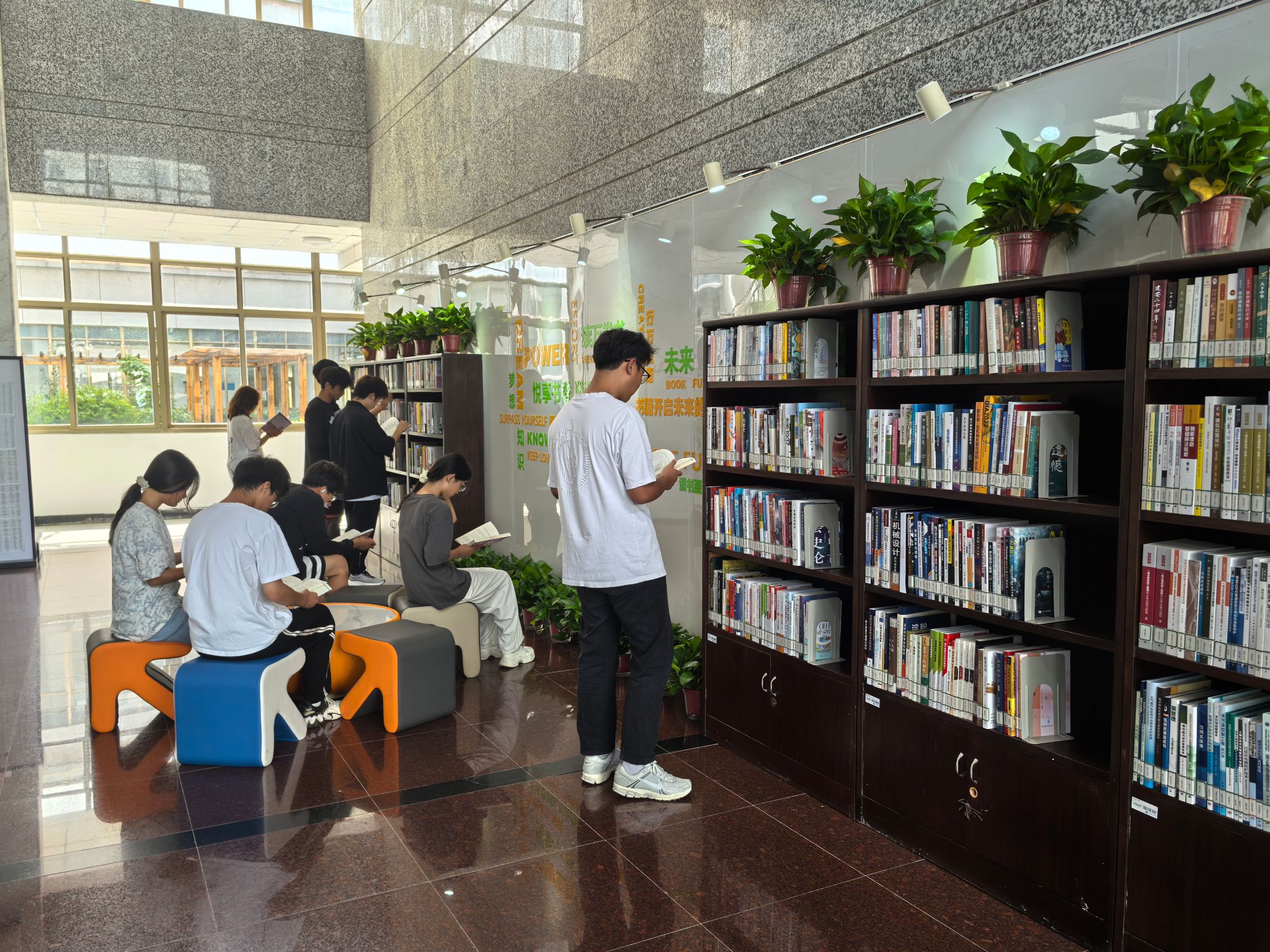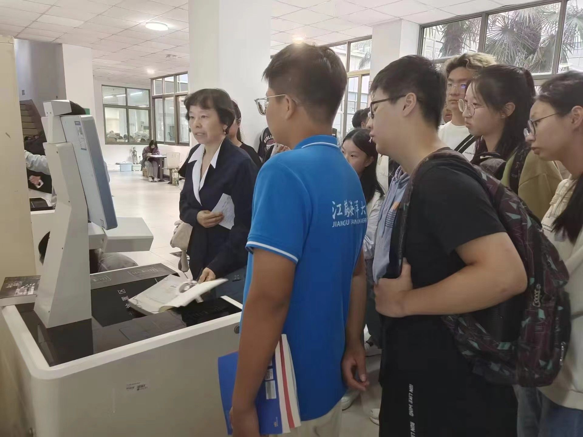 新生到馆后,由负责迎新接待的老师将学生从图书馆东门引入并讲解图书馆的基本情况,然后读书协会的同学组织新生到三楼会议室聆听入馆教育讲座。讲座分别对图书馆概况、资源分布、开馆时间、借阅规则、座位预约、电子资源等方面作详细讲解,着重介绍了图书馆检索系统、各类型数据库、自助借还机等,还宣传了图书馆近年开展的形式多样、内容丰富的阅读推广系列活动。随后带领新生参观各个文献中心,解答并指导新生如何进行线上线下借阅等实践操作。同学们走进图书馆、走进书的海洋、看到整洁温馨的馆内环境和配套设施完备的自修空间,有的新生还在工作人员的指导下完成了借书流程,从图书馆借走了自己心仪的第一本书。此外,图书馆北门大厅的新设立的新书展区也吸引了新生驻足浏览。