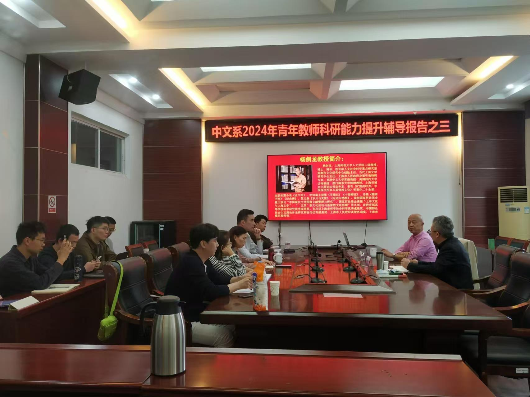 当天上午,杨剑龙教授在文渊楼216室为中文系青年教师开展了一场科研能力辅导报告会,就论文撰写与课题申报等方面提供了宝贵的建议与指导。他教授建议青年教师要开拓学术自留地精耕细作,要不弃涓涓溪流拓宽学术滋养,要与时俱进清醒的学术意识。此次辅导会使青年教师们受益匪浅。