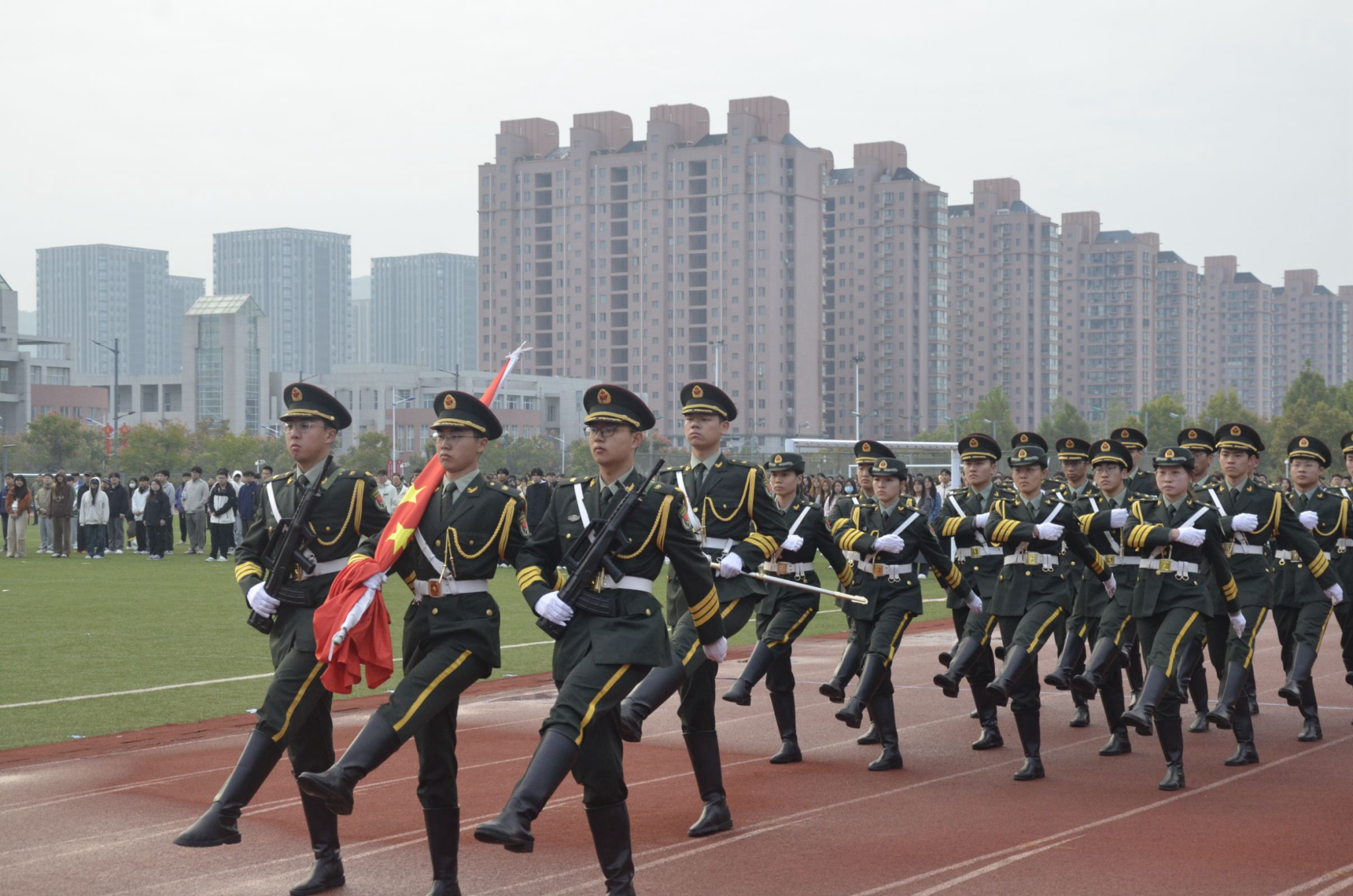 国旗护卫队队员们迈着整齐有力的步伐,护送着鲜艳的五星红旗走向升旗台。伴随着《义勇军进行曲》,国旗缓缓升起,整个会场庄严肃穆,同学们注视着那抹鲜红跃然空中,心跳的节奏似乎与之同拍,自豪之情难以言表。
